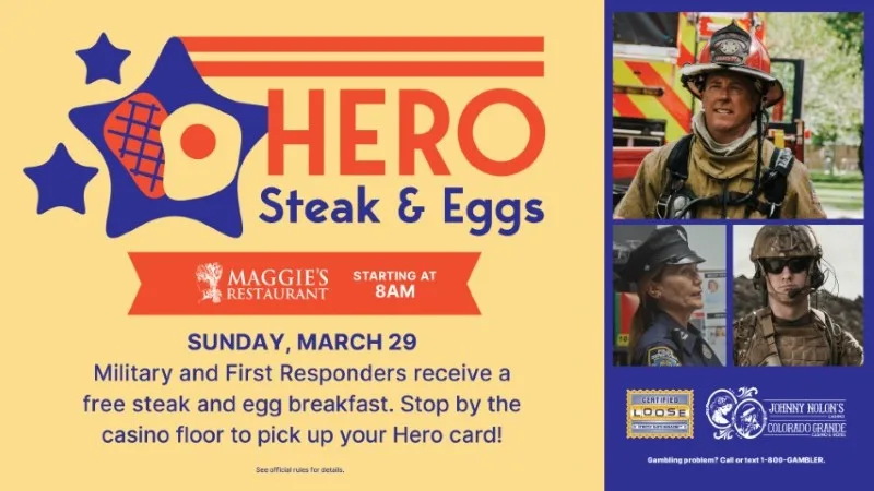 Military and First Responders receive a FREE Steak & Egg Breakfast on Saturday, March28 —Vietnam Veteran’s Day.