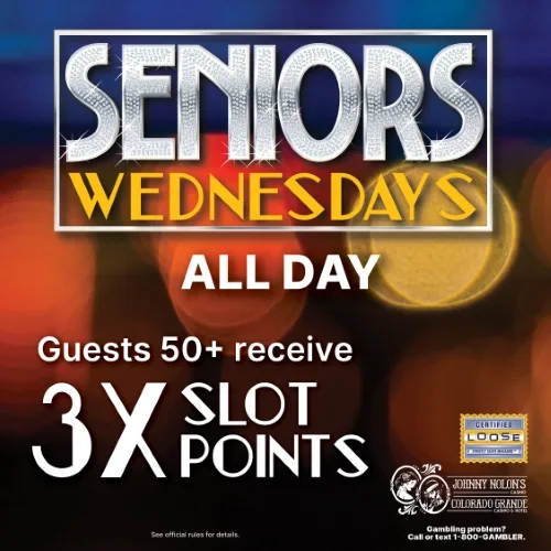 Seniors Wednesdays Guest 50 Receive 3X Slot Points All Day! + Add to Google Calendar + iCal / Outlook export The event is finished. Date Jan 28 2026 Expired! Time 8:00 am - 6:00 pm Share this event